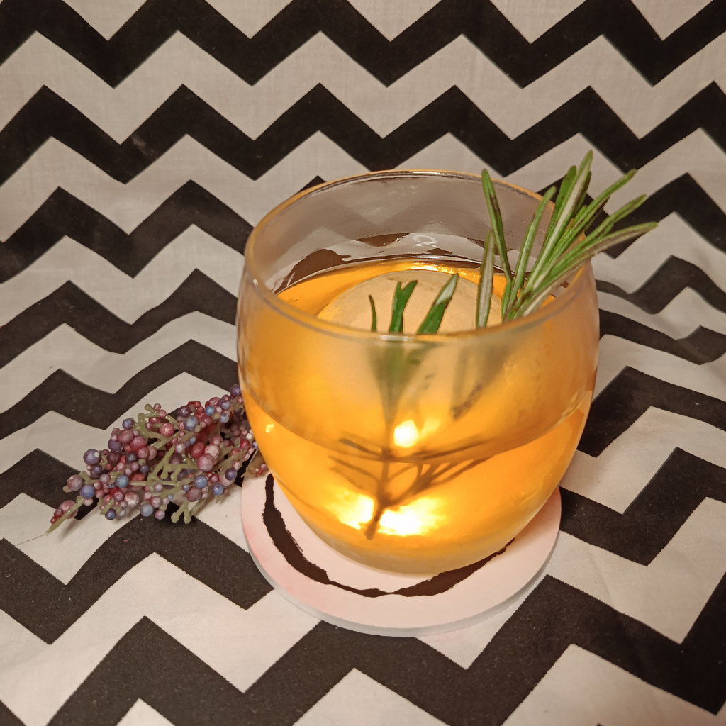 Ingredients: Old Well N2 gin, Roner Zirbel pine liqueur, homemade pine needle liqueur, cardamom & chamomile bitters, served with a fresh rosemary twig