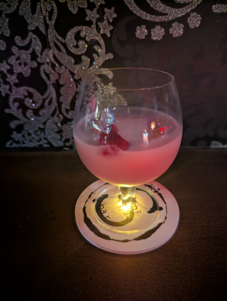 Ingredients: 43 vegan horchata cream liqueur, Arctic Oats vegan cream liqueur, Yosu spiced rum liqueur, raspberry gum syrup, Worthy Park 109 Jamaican rum, served with a dry-frozen raspberry