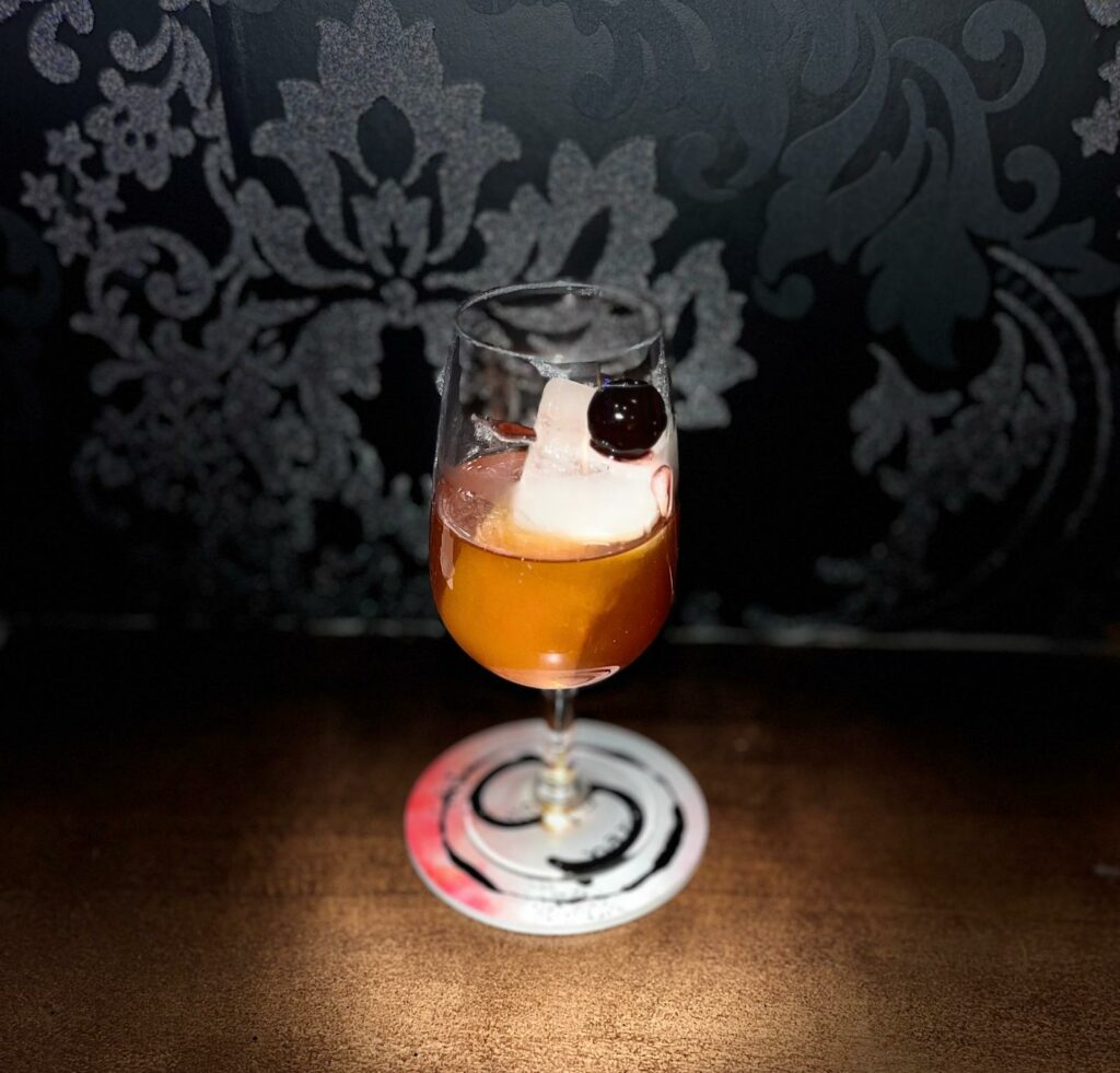 Ingredients: Worthy Park Select Jamaican rum, Luxardo apricot liqueur, sake, Catuma euphoric liqueur, orange bitter, orange squeeze, served with a maraschino cherry