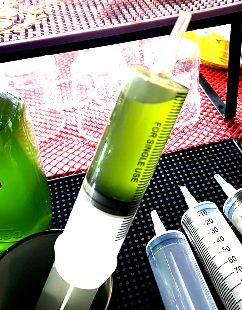 Ingredients: 3-month barrel-aged lemon aperitif infused with fresh basil & camomile, Choya sake, Basilico basil & lime liqueur, Del Santo herbal liqueur, Zyankali absinthe, served thro ugh a syringe