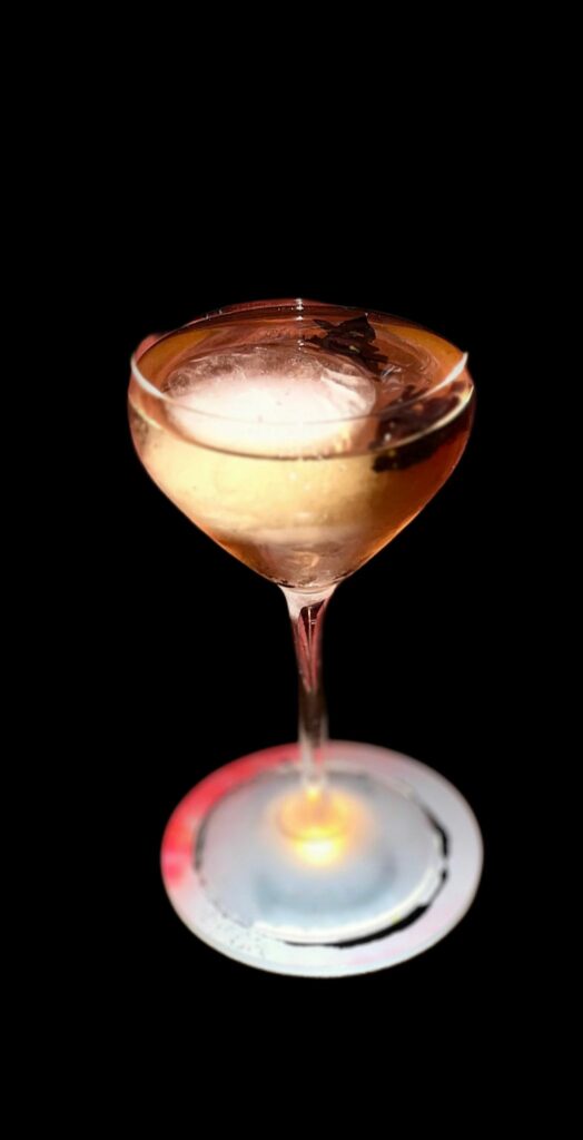 Ingredients: wasabi-infused Rhizom gin, Choya sake, Abacaty avocado spirit, homemade cherry liqueur, served with crispy seaweed.