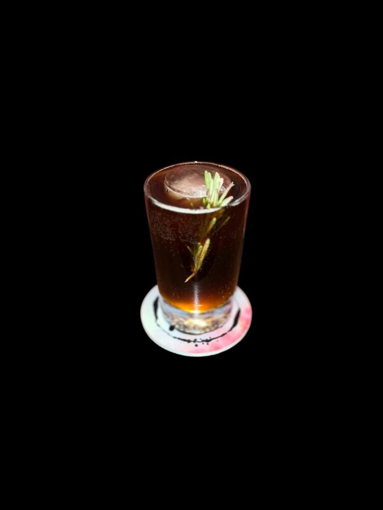 Ingredients: Fuckoff black vodka, Olivea olive amaro, Amaro Clandestino, Selters sparkling mineral water, cranberry bitter, served with a fresh rosemary twig